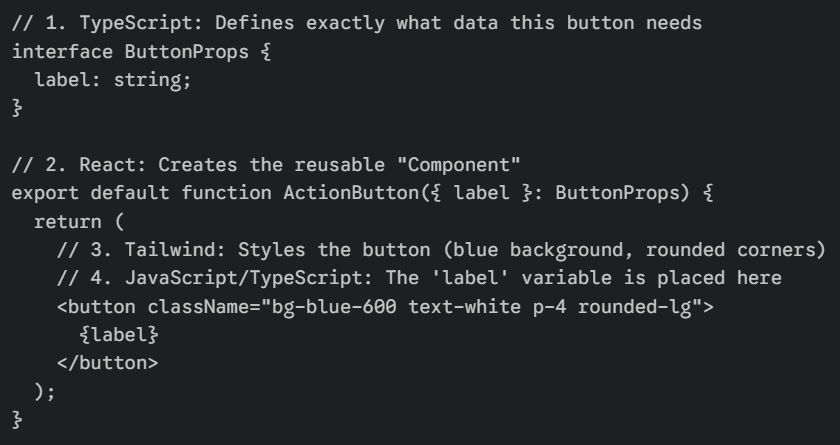 Component Files: You create files like Button.tsx. These are your reusable parts.